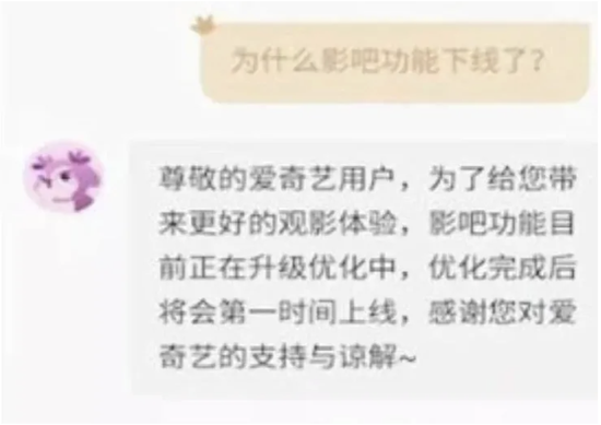 爱奇艺的“影吧”功能就是成果之一。打开爱奇艺,点开想要观看的视频,就能看到下方的“影吧”选项,可建立房间跟朋友一起看视频。该功能上线后并没有引来大量关注,在2019年便被默默撤销,甚至很多爱奇艺的老用户都不知道曾经上线过这一功能,尝试并不成功。