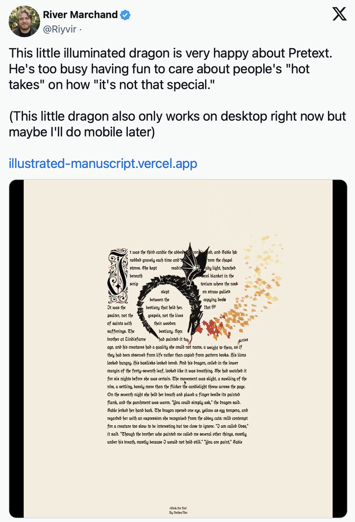 社区的反应印证了这一点。发布72小时内,有人实现了Knuth-Plass段落对齐算法——一种以前只有专业排版软件才有的高端印刷技术;有人做了手机倾斜时字母像物体一样“滑落”的实验;甚至有人做了边看电影边读原著的网页应用,所有文字都能实时交互。批评者说这些演示让文字根本没法正常阅读,但支持者认为这只是在试探新能力的边界——项目才发布不到一周而已。