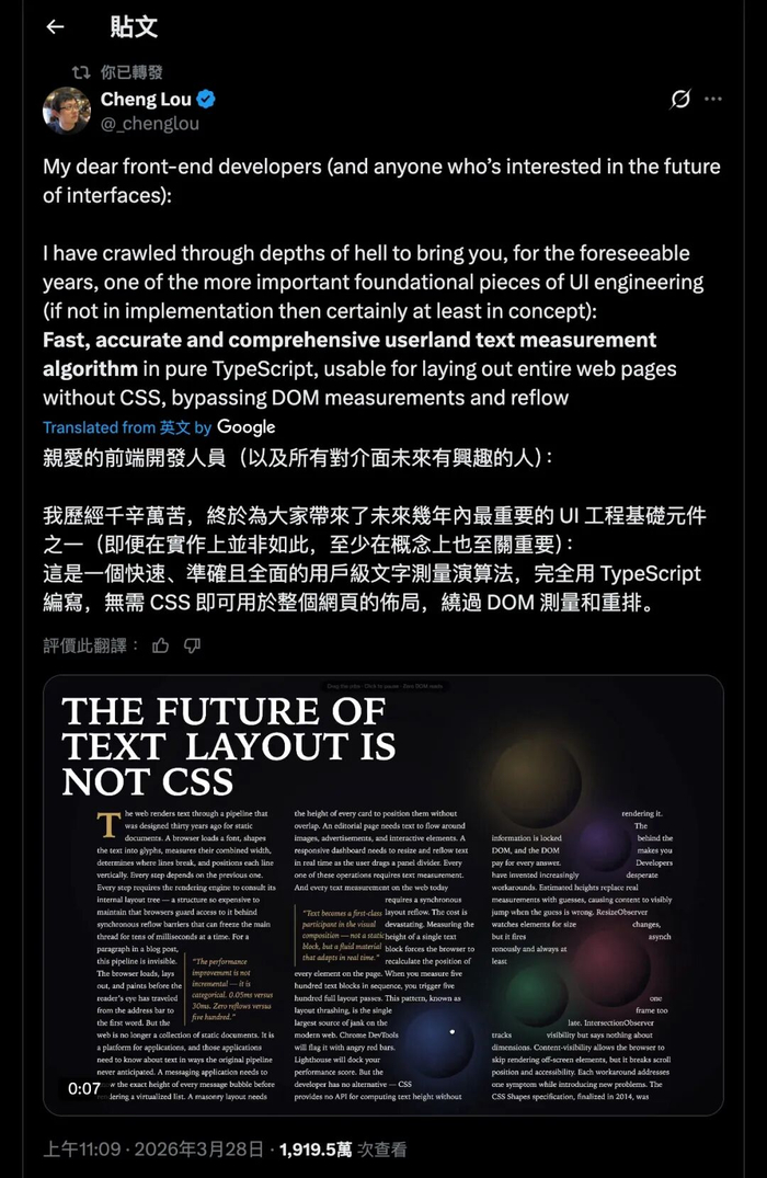 说到底,Pretext能不能真正改变网页排版的未来,现在下结论还太早。文档还不完善,生态从零开始,“大多数网站根本不需要这个”的质疑也有道理。但对于那些确实需要极致文字排版性能的场景,它提供了一个前所未有的选择。而一个人借助AI工具在几周内就做出了这样的基础设施,这件事本身可能比Pretext更值得关注——它在重新定义“一个人能做到什么”的上限。