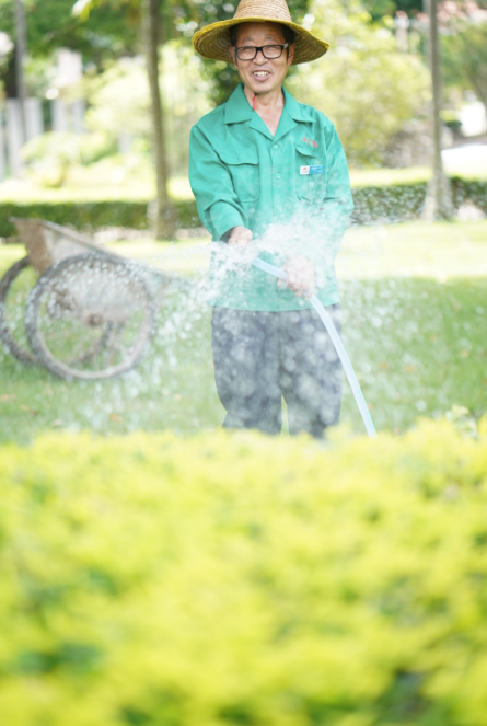 6月27日一早,吴桂春六点就起了床,他戴着草帽,换上绿色工装服、蓝色长裤,拿着一把树枝剪,开始了新工作。吴桂春觉得挺满意,新工作包吃包住,宿舍有空调,每天工作八小时,一个月休一天。工作地点在室外,空气好,小区的绿化也好,不会长时间在太阳底下暴晒。