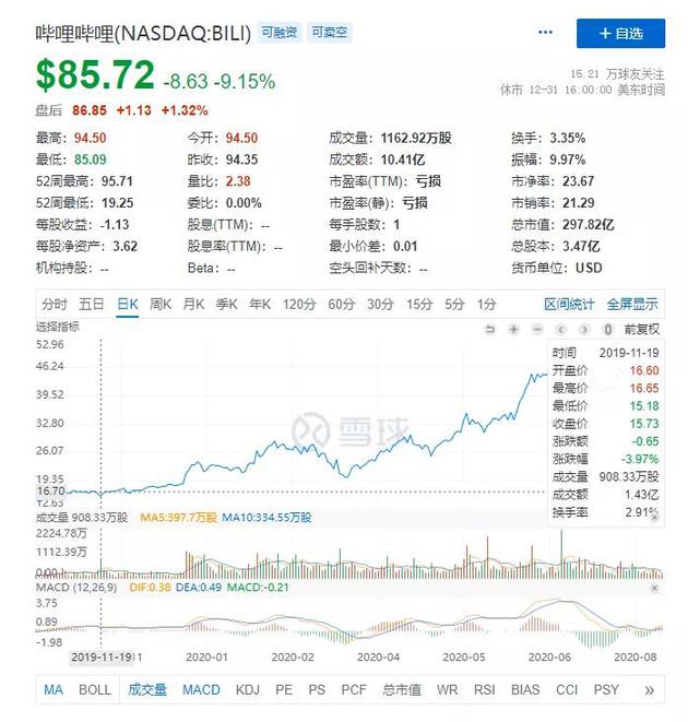 频频出圈的纳新在数据上发挥了作用,B站第三季度财报显示,三季度营收32.3亿,同比增长74%。出具财报的第二天,截至美东时间2020年11月19日美股收盘,哔哩哔哩股价报58.46美元,大涨22.17%,市值达203.44亿美元;而2019年11月19日的B站股价为15.73美元,这一年,B站股价累计上涨272%。