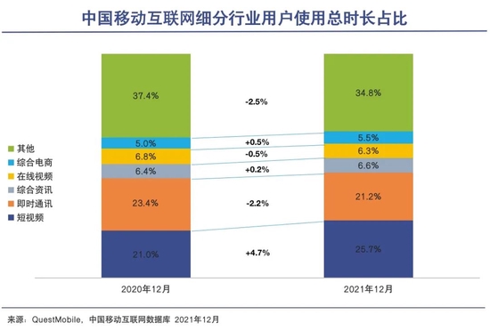 QuestMobile的报告显示,2021年短视频已经超越即时通讯,成为占据人们网络时间最长的行业。也就是说,在所有互联网应用当中,国内用户使用时间最长的就是短视频。
