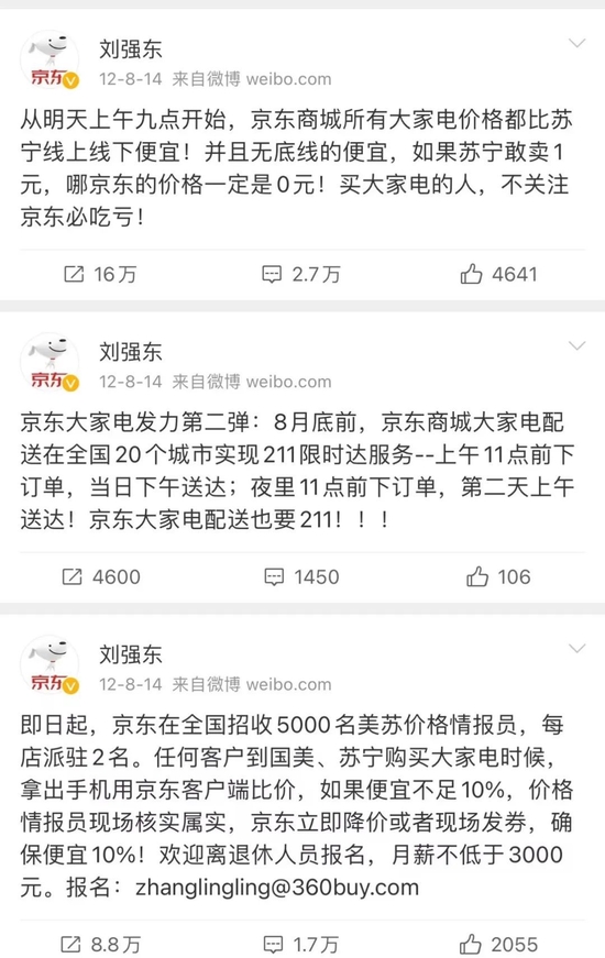 2012年,京东再次以“无底线的便宜”,向几乎“垄断”线下家电行业的两大巨头苏宁和国美发起了价格战。刘强东冲在一线,高呼“苏宁敢卖10元,京东一定是0元”。当时苏宁还调侃“不跟小孩子斗气”,但历史再次重演,京东最终成功改变了人们对3C和家电的消费习惯。